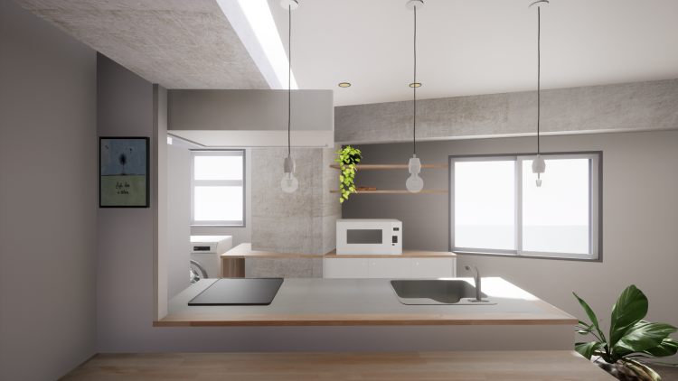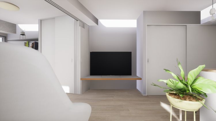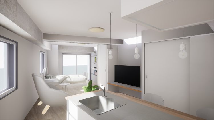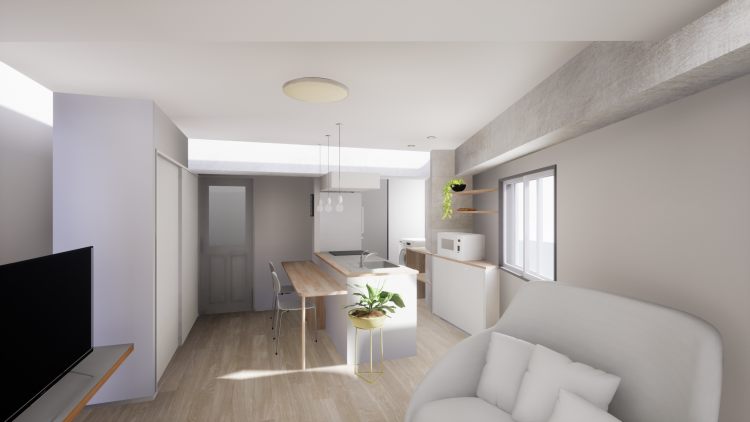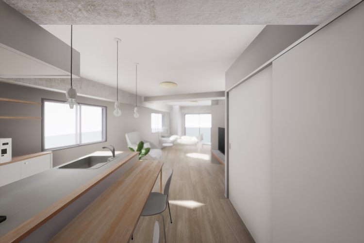LDK入口からのイメージパース。南と西面の窓から光がさして、奥行き感を創り出しています。