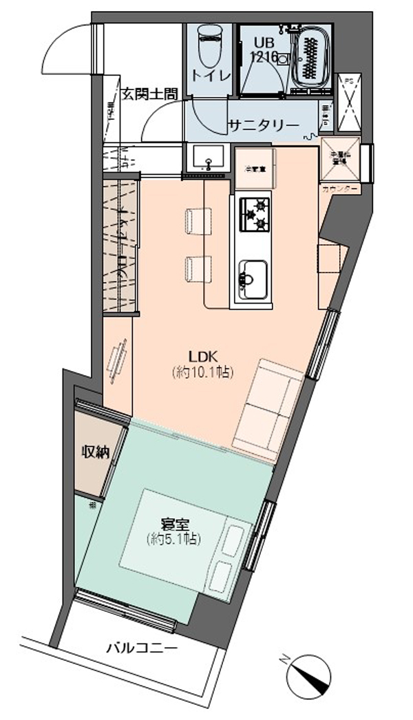 1LDK 専有面積41.66㎡ 可動式間仕切りで、LDKと寝室をフレキシブルに利用できます。角部屋でキッチンにも窓があり、明るい空間を生み出しています。