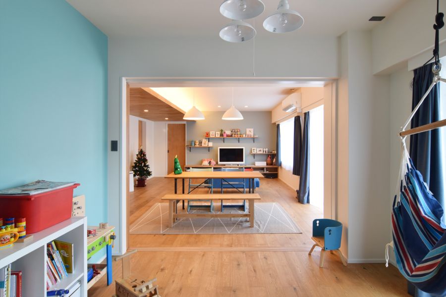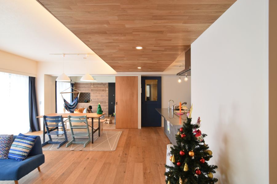 専有面積約100㎡の広さを活かし、大きなLDK、さらに子ども部屋をも引き戸を開け放てばリビングと一体となり、海外生活の経験もあるご家族にとって馴染みのあったホームパーティーし易い空間にしました。